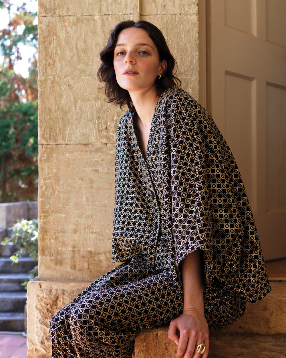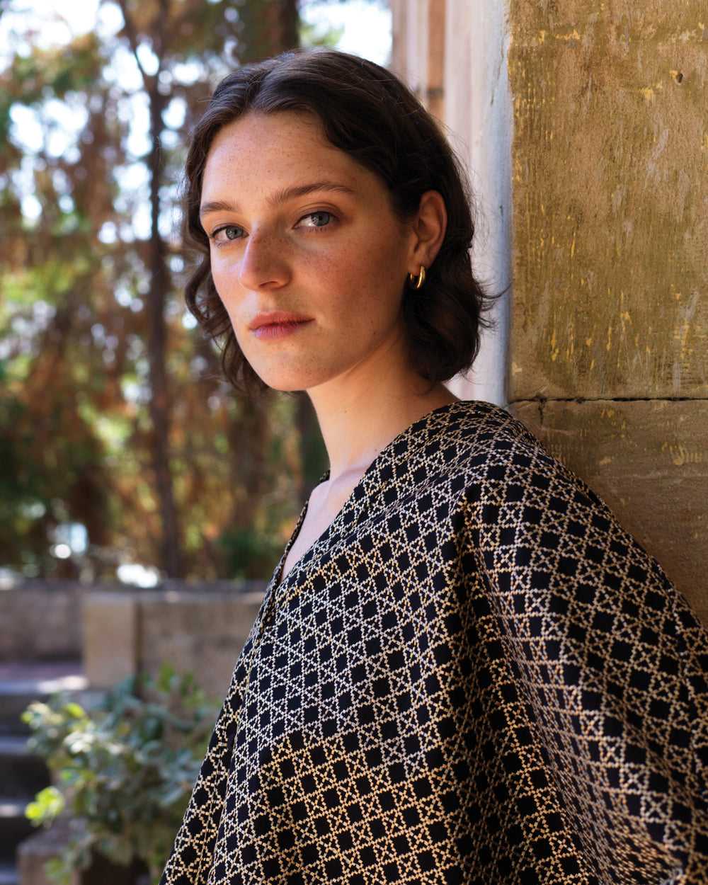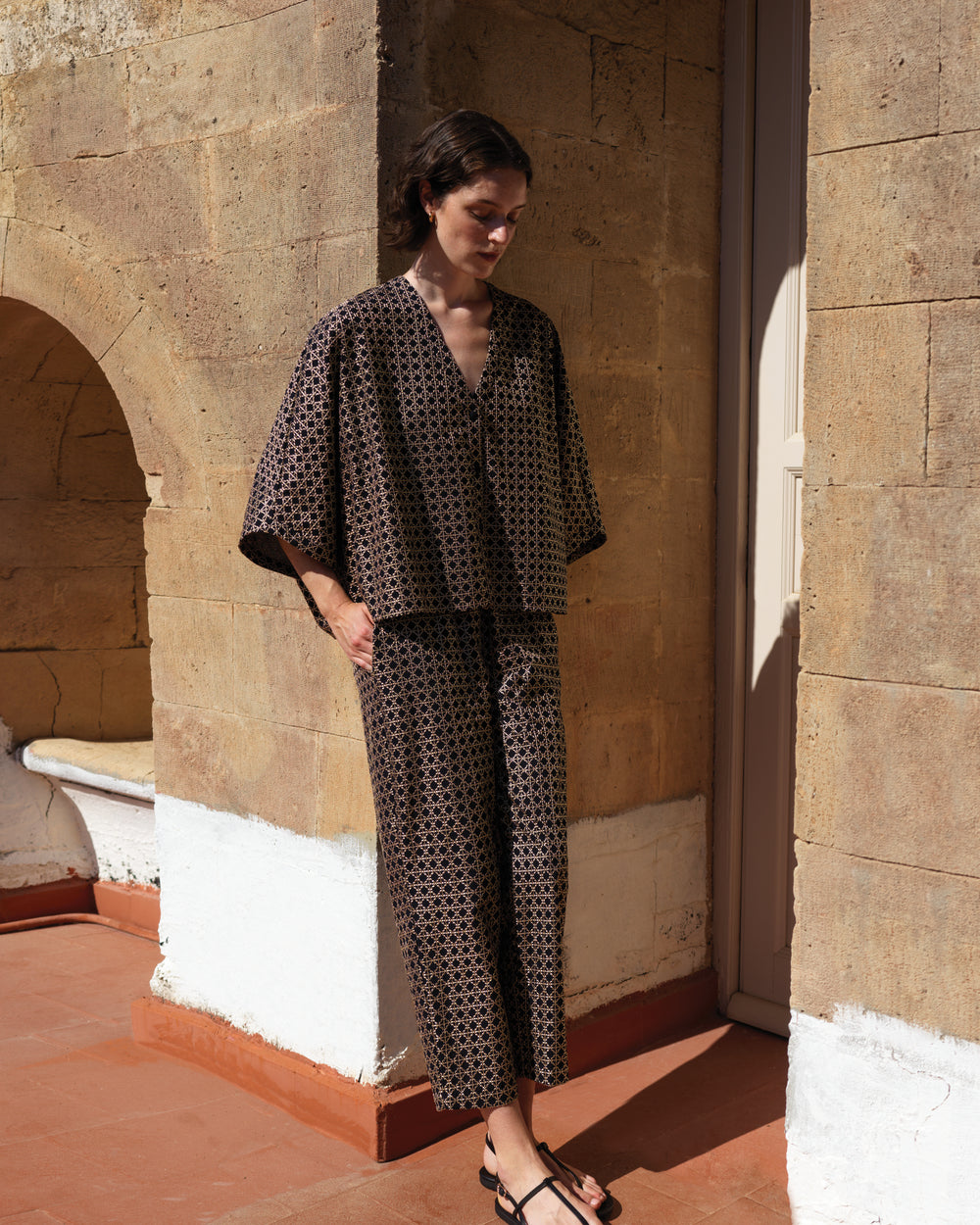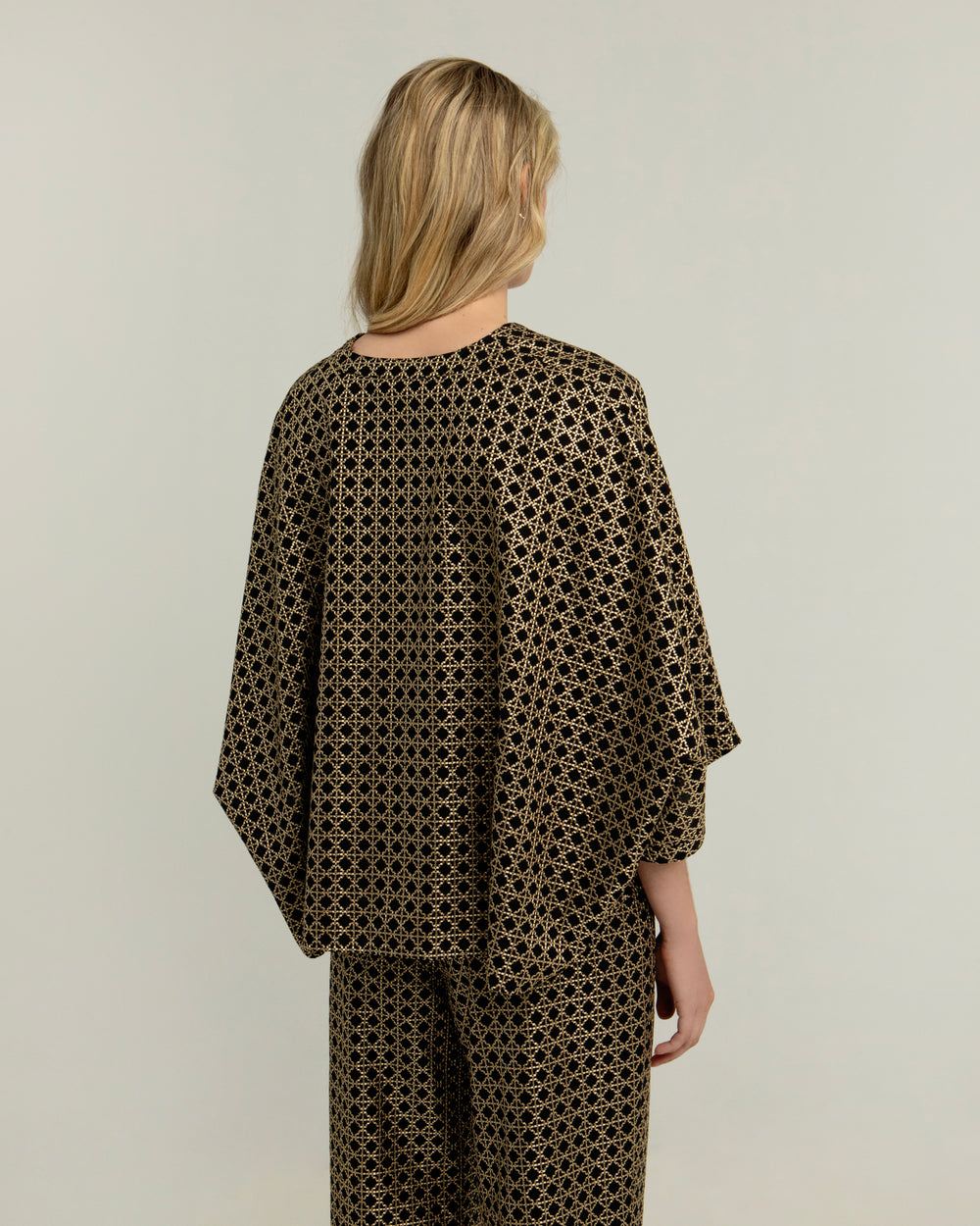 Túnica cross preta com bordados em dourado.