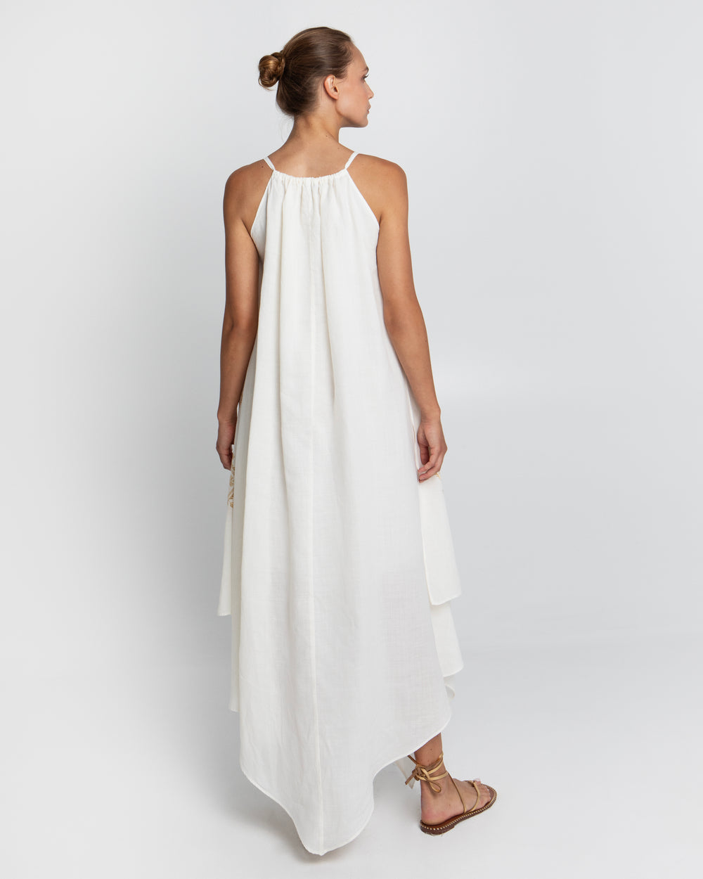 Vestido Lefkada assimétrico alça fina em linho natural com bordado em dourado.